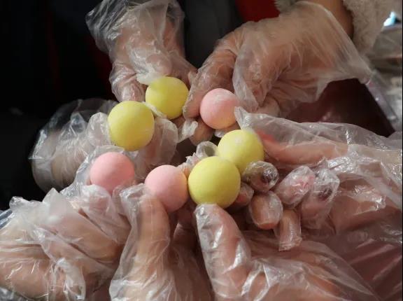 自愿者们分工明确,,,,,,,,有的调馅儿,,,,,,,,有的和面,,,,,,,,厨艺好的则是肩负起包元宵的使命。。。。。纷歧会儿一个个滚圆软糯、五彩缤纷的汤圆就新鲜出炉了。。。。。