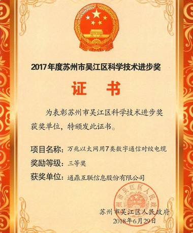 2017年度苏州市吴江区科学手艺前进奖(万兆以太网用7类数字通讯对绞电缆)